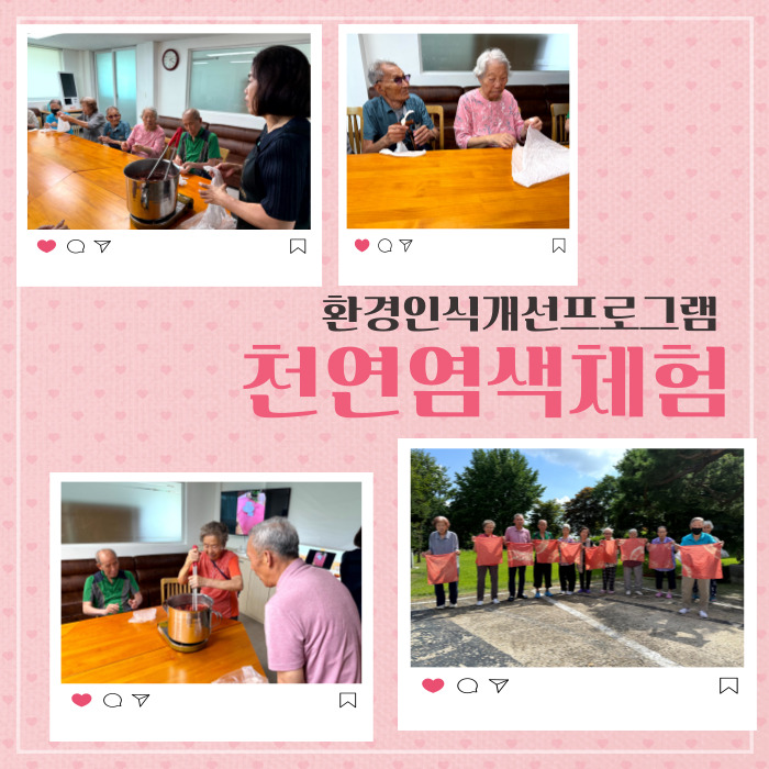 환경인식개선프로그램으로 천연염색체험 하였습니다. 등록일 2025-08-05 조회수 117 천연염색으로 우리가 묶어서 만든 예쁜 손수건이 완성되었어요. 이쁘게 물들어서 몇번이고 빨았더니 예쁜 핑크 색으로 되었지요. 어르신들 모두 예전 생각 난다고 하시며 너무 좋아하셨어요. 행복한 노후를 함께하는 영.락.경.로.원. 목록