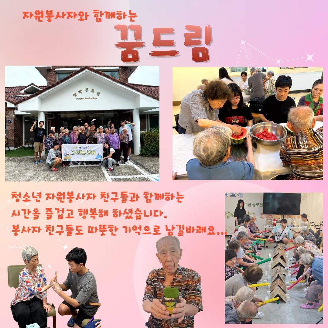 청소년 자원봉사자들과 함께하는 꿈드림!! 등록일 2025-08-14 조회수 107 청소년 자원봉사자들과 함께한 한달여 간의 동행이 어르신과 아이들에게 행복했던 기억의 한 페이지가 될 수 있는 시간이었습니다. 목록
